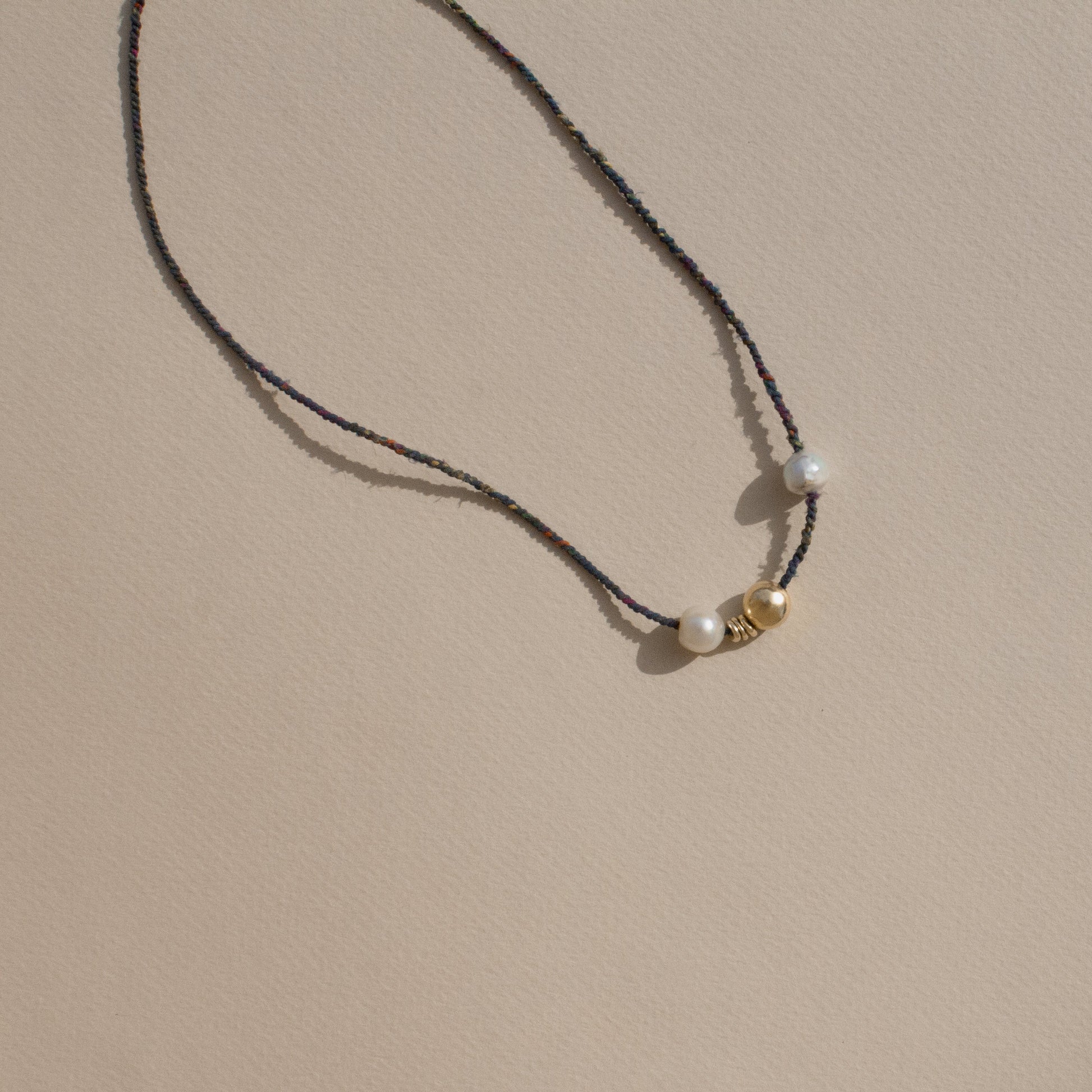 An artful study in texture and balance. The Artist Woven Necklace features a hand-woven strand of gold beads, anchored by two luminous white baroque pearls—each element chosen for its quiet irregularity and natural beauty. The contrast between soft sheen and warm metal gives the piece its effortless, lived-in feel.
